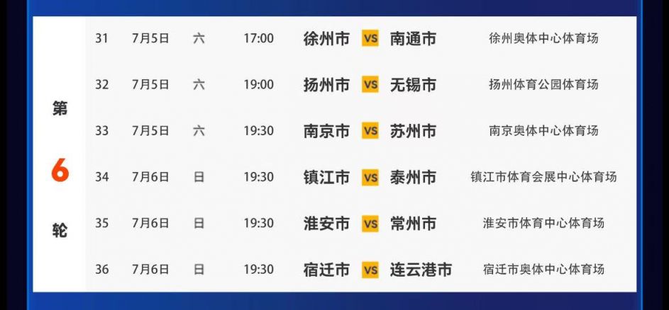 第一场:7月5日 19:00 扬州VS无锡 扬州体育公园体育场