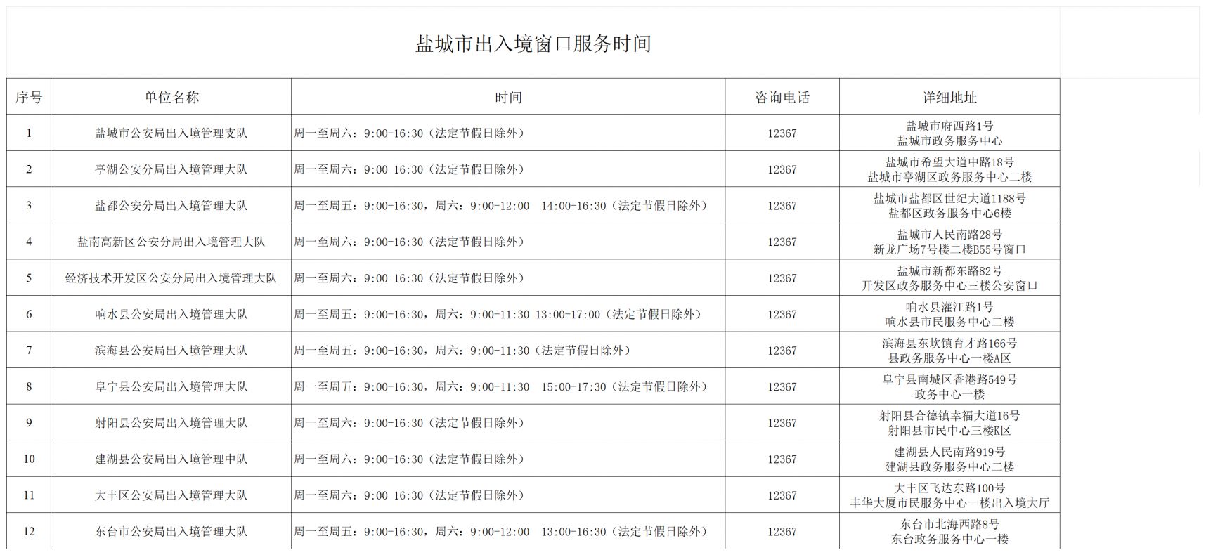 截至我所知的信息,以下是盐城市出入境服务窗口的一些基本信息。请注意,具体信息可能会有变动,建议在前往之前先进行电话确认。