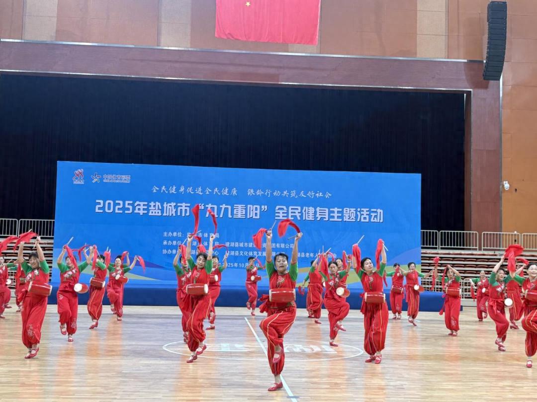 本次活动由盐城市体育局主办,建湖县体育局、建湖县城市建设投资集团有限公司联合承办,分为体育馆内、外两大活动区域。馆内启动仪式简洁庄重,老年人健身项目展演精彩纷呈,腰鼓《盛世欢歌》激昂豪迈,莲湘《莲歌欢舞》尽显民俗韵味,柔力球《柔球呈祥》、健身球《福运健球》、太极《银龄扇韵》及广场舞《美丽中国》等节目轮番上演,充分展现了该市老年朋友们的活力与风采。