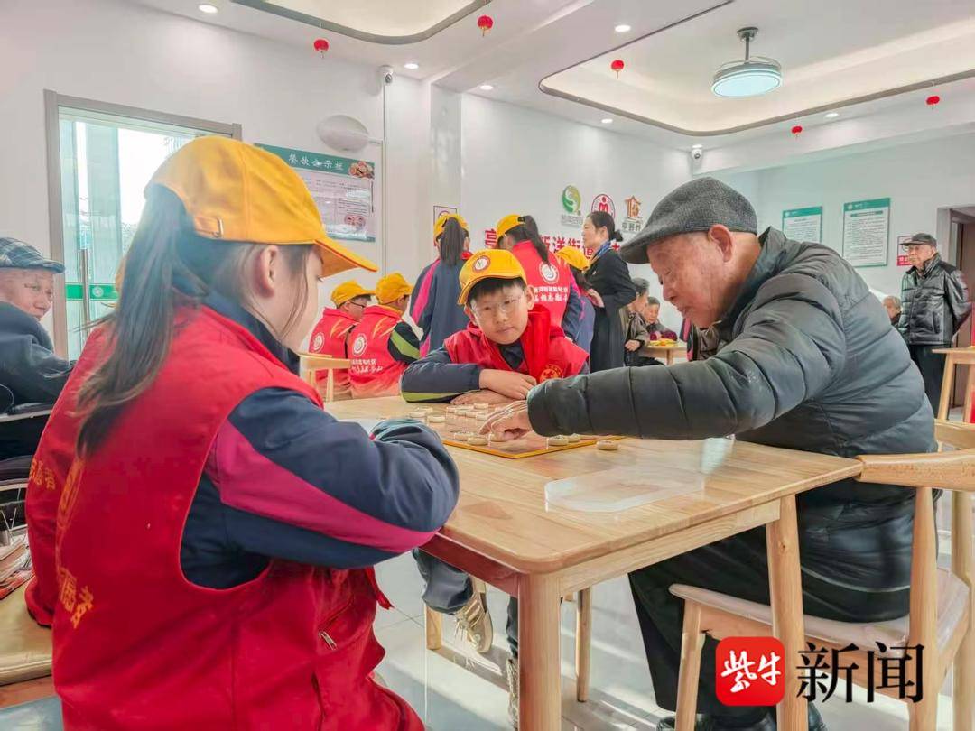 活动现场,“小小盐”志愿者们分工明确,热情洋溢。在社区长者幸福食堂,红色的墙面映衬出一幅温馨的画面:“小小盐”志愿者正贴心地为坐轮椅的张爷爷递上象征平安的柑橘。象棋桌旁,小志愿者与袁爷爷的对弈正酣,一老一少在楚河汉界间你来我往,不时传来爽朗的笑声。另一边,小志愿者捧着故事书,为围坐的老人朗读经典篇目,稚嫩的童声与老人的赞叹声交织在一起,形成和谐的乐章。这座食堂不仅是老人们的“暖心饭堂”,更在此次活动中化身为“老少同乐”的温馨驿站。